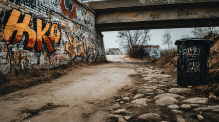 An outdoor scene features a pathway leading under a concrete bridge with walls covered in colorful graffiti art. The composition showcases a gritty, urban aesthetic, with variations in texture. Lighting appears overcast, suggesting a daytime setting with the potential for commercial and editorial applications.