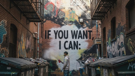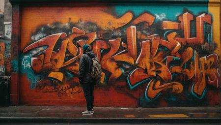 A person stands before colorful graffiti on a brick wall in a narrow alley. The artwork features bold text against a backdrop of abstract colors. The scene is illuminated by natural light, creating shadows on the surrounding buildings. This image could be suitable for editorial content or design projects.