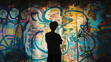 Silhouetted against the colorful backdrop a person stands with arms crossed seemingly mesmerized by the detailed graffiti surrounding .