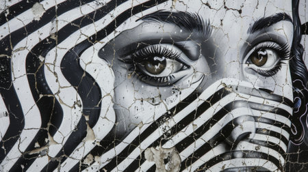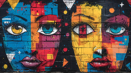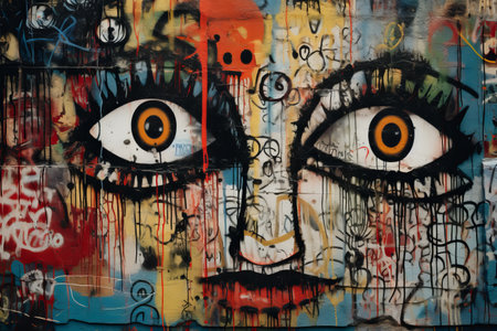 A striking graffiti mural captures the essence of urban art with a bold depiction of colorful, stylized eyes on a city wall. Resplendent.