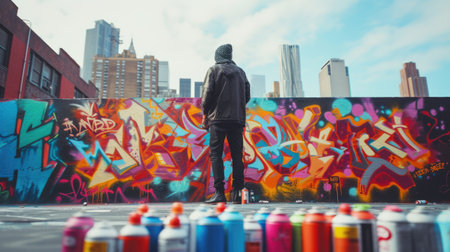A street artist creating graffiti art with aerosol cans, adding vibrant colors to an urban wall.