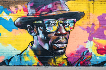 This striking mural reveals a black man's portrait, highlighted with vivid colors and bold street art influences, capturing the essence of urban creativity.