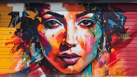 Vibrant street art portrait of a woman with bold colors and intricate details