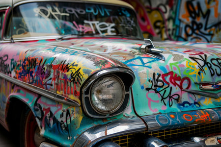 Vintage car covered in colorful graffiti AI generated
