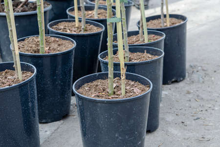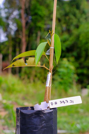 Close up shot of young baby durian tree with tagging of variety in nursery