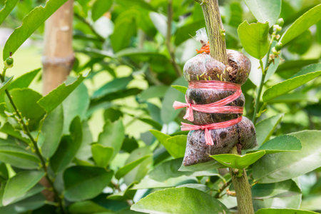 Lime propagation , grafting tree plant on lemon tree branch in organic agriculture farm