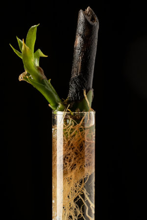 Bamboo tree and root with green leaf in glass test tube filled with water on black ground close-up