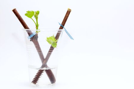 Blossoming seedlings of a vine on a white background. The growth of young grapes leaves in the nursery.