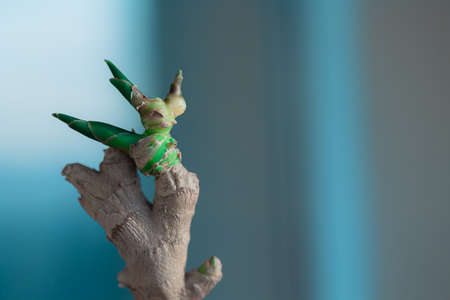 Yellow dry wrinkled ginger root sprouted in small green sprouts against a bright blue bokeh background. Close-up