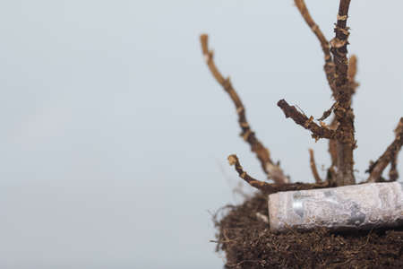 A dead plant with an earthen clod. Corroded batteries around. Waste recycling and environmental protection.