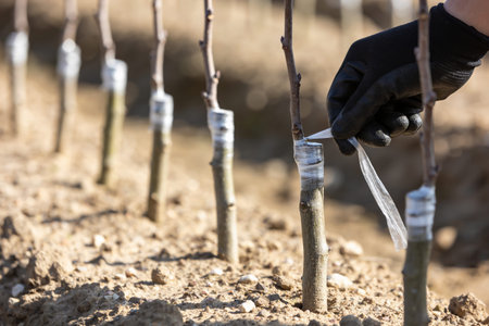 Gardener wraps grafted place by grafting tape 2018