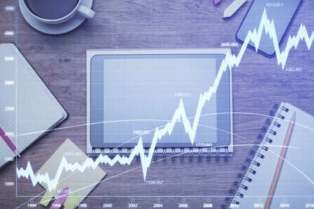 Multi exposure of forex graph hologram over desktop with phone. Top view. Mobile trade platform concept.