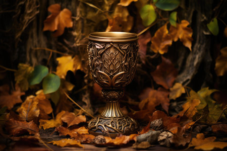 bronze chalice surrounded by scattered autumn leaves, created with generative ai