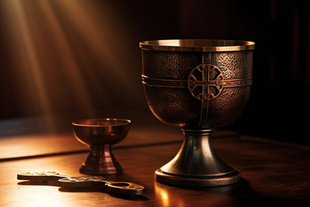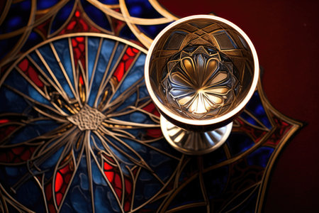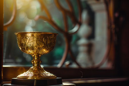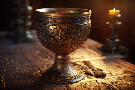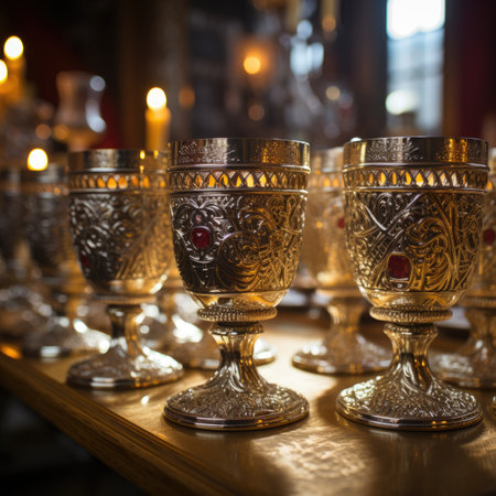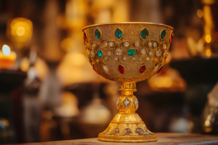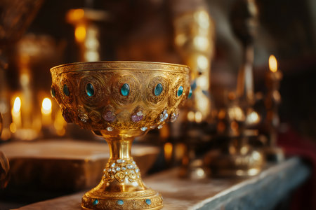 Intricately designed golden chalice adorned with colorful gemstones, resting on an altar with soft candlelight creating a warm, sacred ambiance
