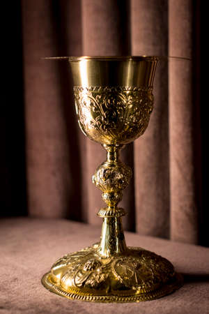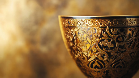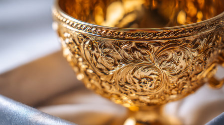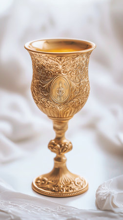 Ornate Golden Goblet with Intricate Symbolic Design on Elegant Fabric. Concept of Luxury, Tradition, and Sacred Rituals. Purim. Vertical.