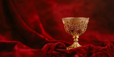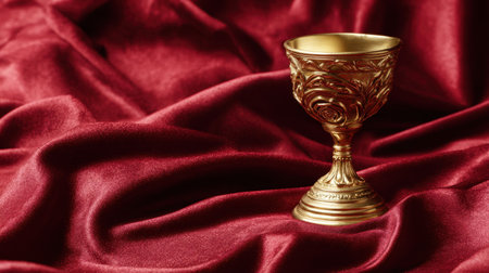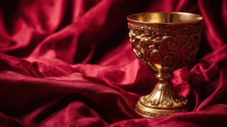 Ornate Golden Chalice on Luxurious Red Velvet Fabric Background.
