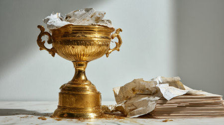 This striking image features a golden trophy resting amidst crumpled papers, symbolizing achievement and artistic creativity in a minimalistic setting.