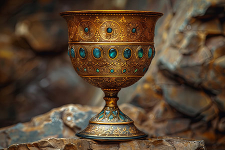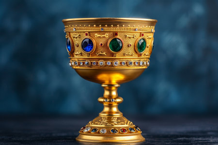 Intricately designed golden chalice adorned with colorful gemstones, set against a blurred background, evoking a sense of historical elegance