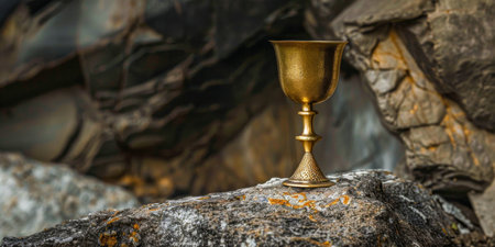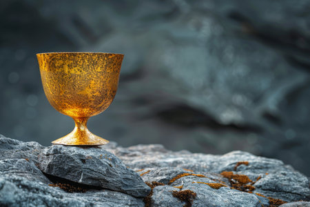 A gold cup is sitting on a rock. The cup is shiny and has a unique design. The has a sense of mystery and intrigue, as the cup is placed in an unusual setting