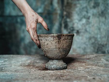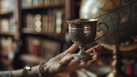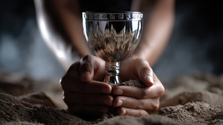 A person is holding a silver cup in their hands. The cup is placed on a sandy surface, and the person appears to be holding it with care. Concept of reverence and importance