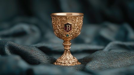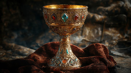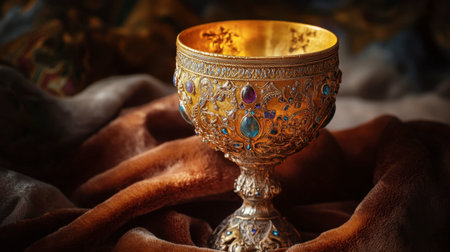 An exquisite golden chalice adorned with colorful gems, resting on rich fabric. This image captures the elegance and intricate craftsmanship of the piece, showcasing timeless beauty.
