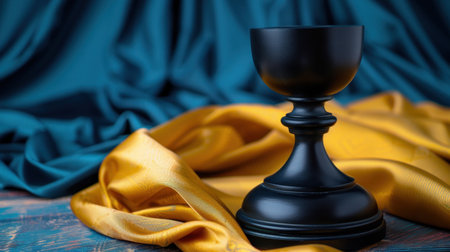 A refined black chalice stands elegantly on rich, textured fabric, showcasing a harmonious blend of deep blue and vibrant gold, perfect for artistic displays.