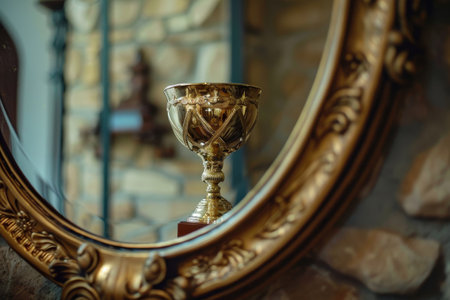 The reflection of a golden trophy in a mirror. --ar 3:2 Job ID: 5c728ede-09c4-4a66-accd-2f85db2ccaee