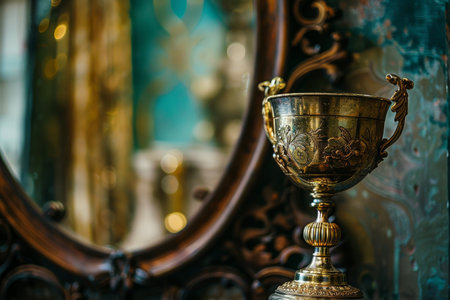 The reflection of a golden trophy in a mirror. --ar 3:2 Job ID: 73b2868e-7034-4d17-8aae-b81fa6b0a7f8