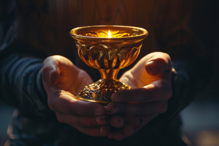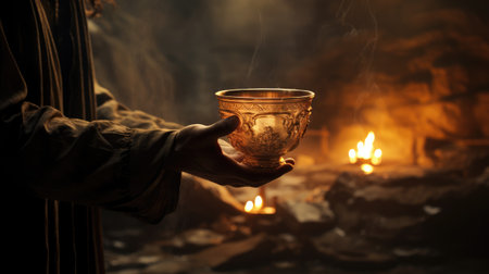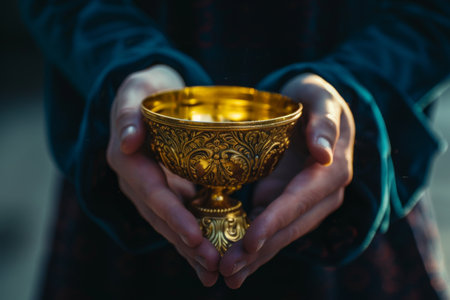 A close-up view of an individual holding a golden chalice while reviewing an important document, creating an atmosphere of significance and tradition.