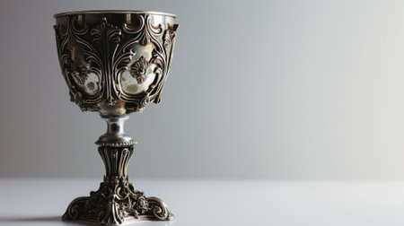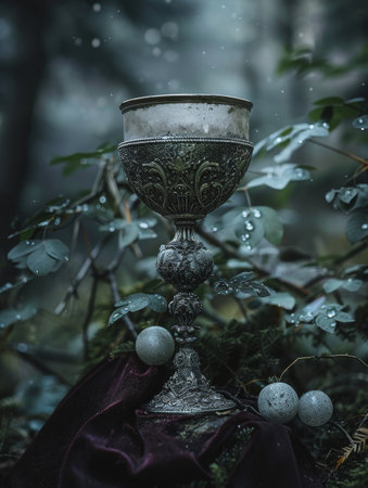 This captivating image features an ornate silver chalice set on a reflective surface. Rays of light create a mesmerizing atmosphere, enhancing the artistic allure.