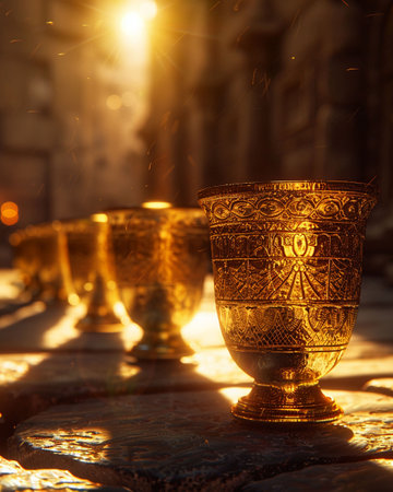 Ancient Egyptian, Aged Gold, Intricate engravings, Cups embodying the mysticism of ancient times and their relationship with the divine, set in a dimly lit temple Realistic, Sunlight, Depth of Field Bokeh Effect