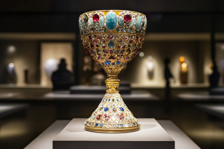 A jewel-encrusted chalice stands elegantly on a pedestal in a museum, showing its vibrant gems and intricate design. Soft lighting accentuates its beauty and craftsmanship.