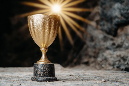 A stunning golden trophy rests elegantly on a stone surface, symbolizing triumph and recognition. Its ornate details reflect a rich history of achievements and celebrations.