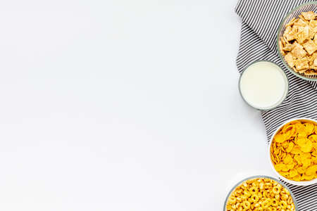 Assortment of different kinds cereals placed in ceramic bowls with cornflakes, granola, cereals and oatmeal. The concept of breakfast food. Flat lay, with copy space, top view on white wooden table.