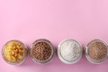 Storage of rice, buckwheat, wheat groats and pasta in glass jars. Crisis food stock for quarantine isolation period on pink background, Top view, Copy space