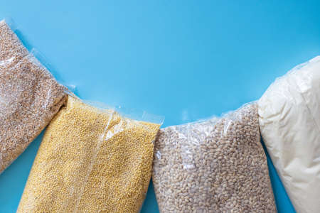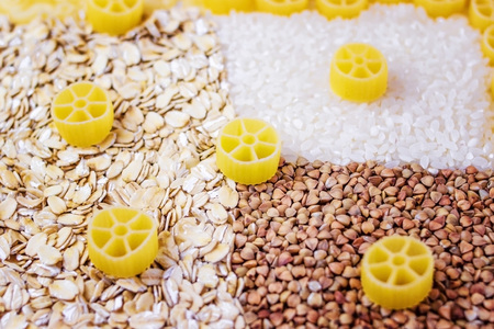 Dry foods of healthy nutrition, seeds of healthy foods, rice, buckwheat, pasta, pasta, dried products, background or texture