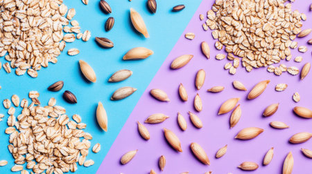 A vibrant arrangement of various grains and seeds on blue and purple backgrounds, showcasing their textures, ideal for health and nutrition projects.