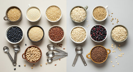 An assortment of single-grain types such as brown rice, wheat berries, and steel-cut oats, arranged in a visually appealing pattern on a white background.
