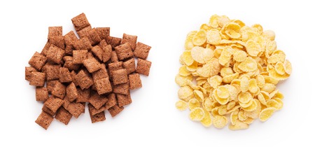 Piles of chocolate pillows and corn flakes cereals isolated over white background, top view
