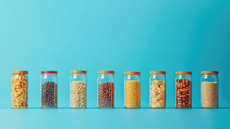 This image showcases a row of transparent jars filled with various grains and nuts, beautifully arranged against a bright blue background, perfect for kitchen decor.