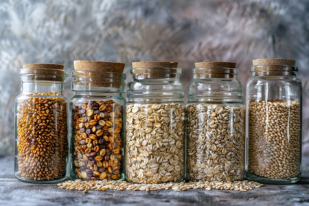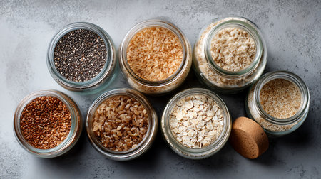 a set of cereals on the table in glass jars generative ai.