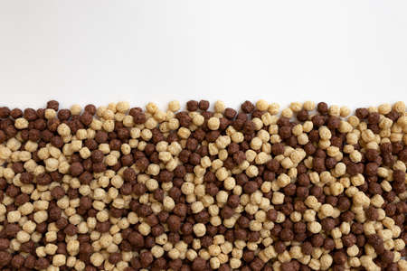 chocolate and vanilla breakfast cereal texture, cereal balls as background, chocolate corn balls in form of frame with ampty space for text, top view