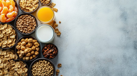 Various breakfast cereals, whole grain cereals, diet healthy food, White background isolate. Header banner mockup with copy space. AI generated.