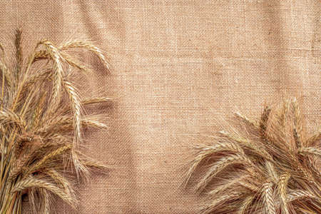 Several wheat spikelets freshly laid out in the frame on the sackcloth