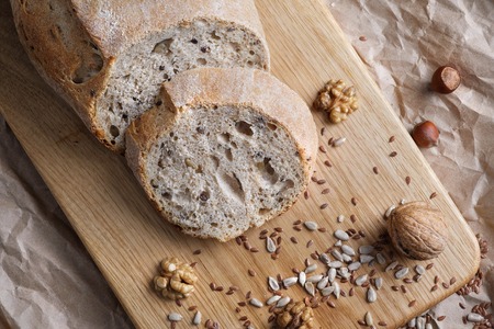 Bread from wholemeal flour and seeds sunflower, flax, sesame. Creative food idea, background texture