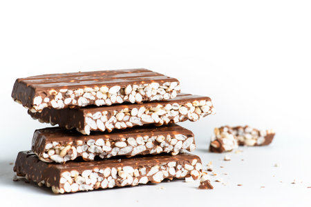Chunks of milk chocolate with puffed rice isolated on white background