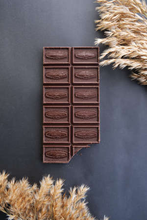 Background International Chocolate Day milky dark chocolate on a gray black background with a copyspace place for text.