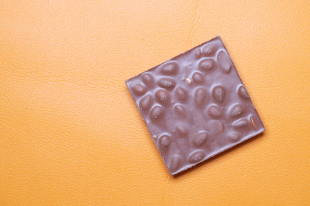 dark chocolate with almond nut on orange background