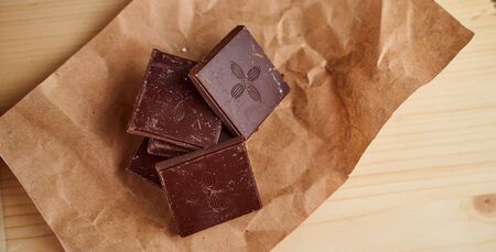 chocolate cubes broken on brown paper on the table