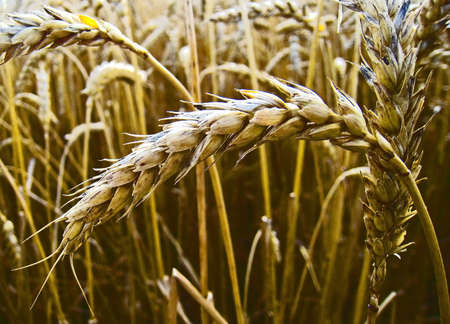 Wheat ears in a field close up on a blurred background,